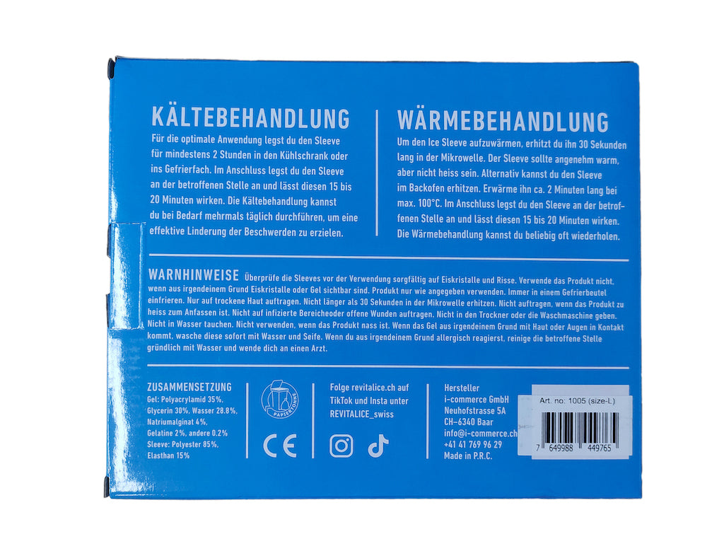Der grosse Vorteil: Du musst den Beutel nicht umständlich fixieren. Die RevitalIce Ice Sleeves passen sich ganz natürlich Deiner Körperform an und lassen Dir dabei die volle Bewegungsfreiheit. Ein weiteres Plus ist, dass die Sleeves auf der Haut super angenehm sind und das hochwertige Material dazu noch geruchsneutral ist.